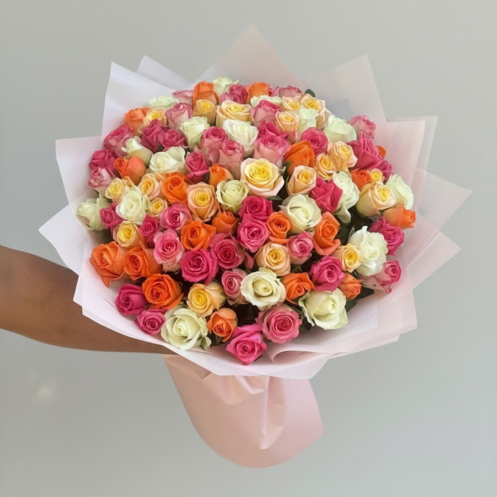 Colour Burst – a radiant bouquet of 101 roses in dazzling shades of white, orange, dark pink, peach, and pink double tones. A true celebration of colour and beauty, this vibrant arrangement is perfect for making a grand statement and filling any moment with joy, love, and elegance.
