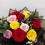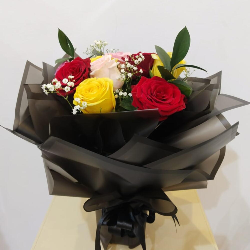Unleash the perfect symphony of love and warmth with our Mono Bouquet, composed of 4 passionate Red Roses, 3 tender Pink Roses, and 3 cheerful Yellow Roses. The combination is sprinkled with 5 enchanting strands of Gypsophila and is complemented by 2 lush leaves, creating a beautiful balance of hues and textures. This bouquet is not just an arrangement, but a poetic expression of emotions. Perfect for all occasions or just because - express your feelings eloquently.