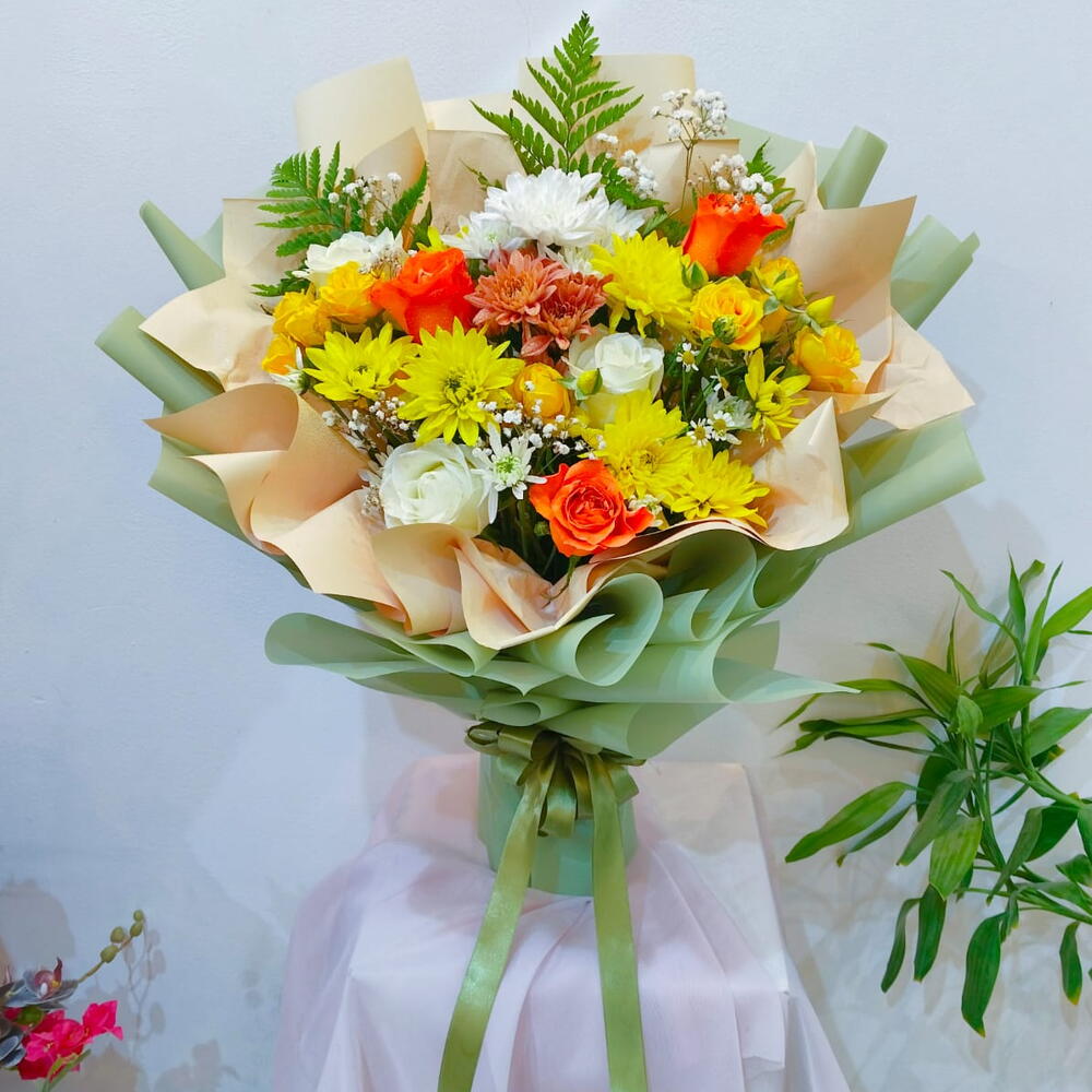 Chrysanthemum - 3 pcs White rose - 3 pcs Chrysanthemum white - 6 pcs orange rose - 3 pcs gypsophila white - 4 pcs chrysanthemum yellow - 6 pcs yellow baby rose - 7 pcs leather leaf - 2 pcs