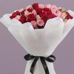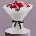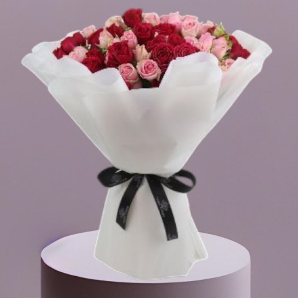 The bouquet in the image features a mix of red and pink roses, wrapped in white paper and tied with a black ribbon. Red roses typically symbolize deep love and passion, while pink roses convey admiration, gratitude, and appreciation. The combination of the two colors can represent a blend of emotions, such as fiery passion balanced with calming serenity.