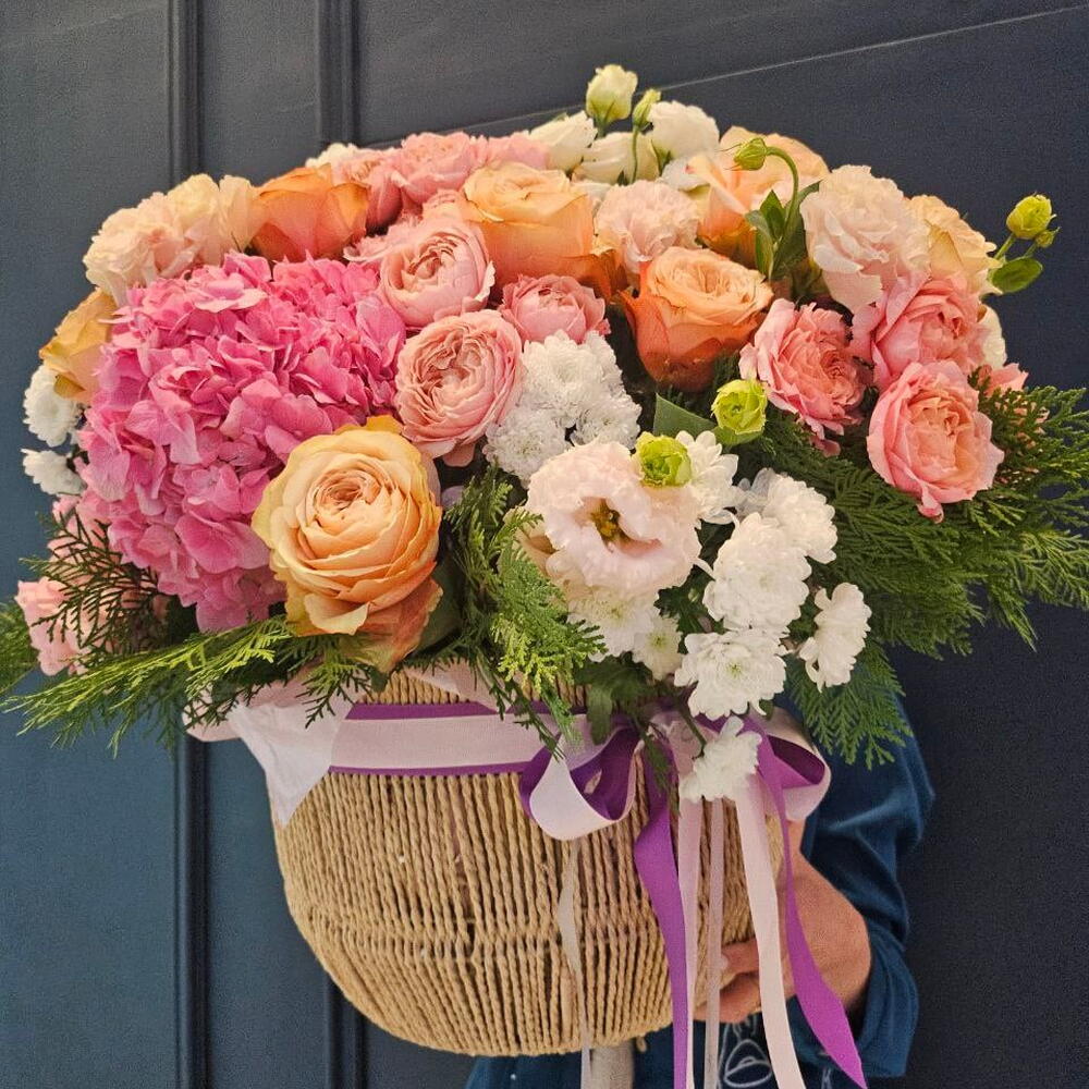 Composition: Hydrangea mix - 7, Rose Pink Expression - 11, Spray Rose Julieta peach - 7, Chrysanthemum Santini - 10, Lisianthus - 13, Thuja - 1, basket - 1 Sizes: WIDTH - 55CM; HEIGHT - 65CM; LENGTH - 65CM; (including packaging) Size: 55 x 65 x 65 cm
