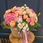Basket - 1 pcs Lisianthus - 13 pcs chrysanthemum santini - 10 pcs hydrangea mix - 7 pcs thuja - 1 pcs rose pink expression - 11 pcs spray rose julieta peach - 7 pcs