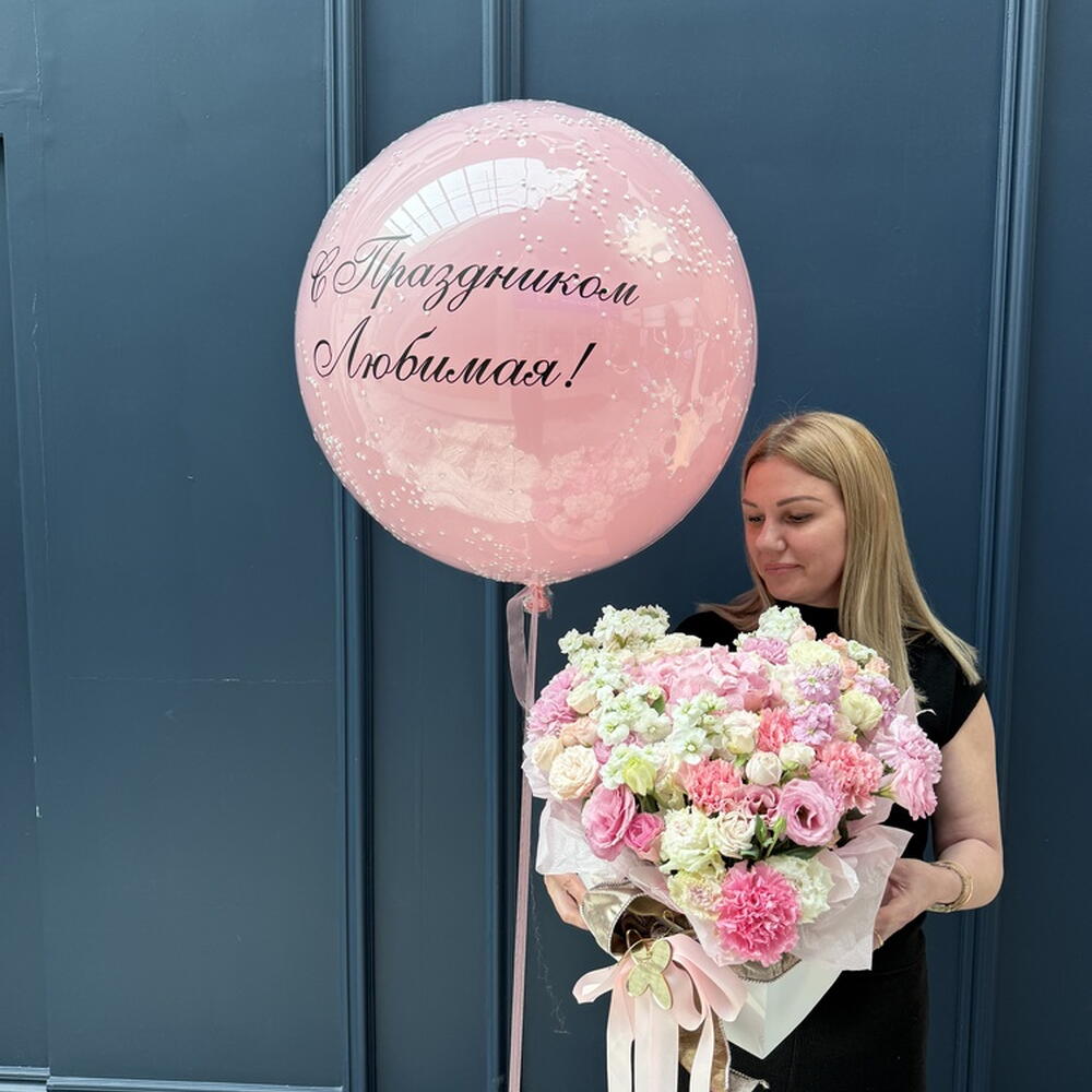 Box - 1 pcs Lisianthus - 7 pcs balloon - 1 pcs hydrangea mix - 1 pcs dianthus mix - 11 pcs rose spray - 6 pcs mattiola spray - 6 pcs