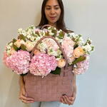 Composition: Hydrangea - 7, kaaps - 8, Mattiola spray - 7, Dianthus spray - 8, Rose David Austin - 7, oasis - 1, bag - 1 Sizes: WIDTH - 60CM; HEIGHT - 60CM; LENGTH - 60CM; (including packaging) Size: 60 x 60 x 60 cm