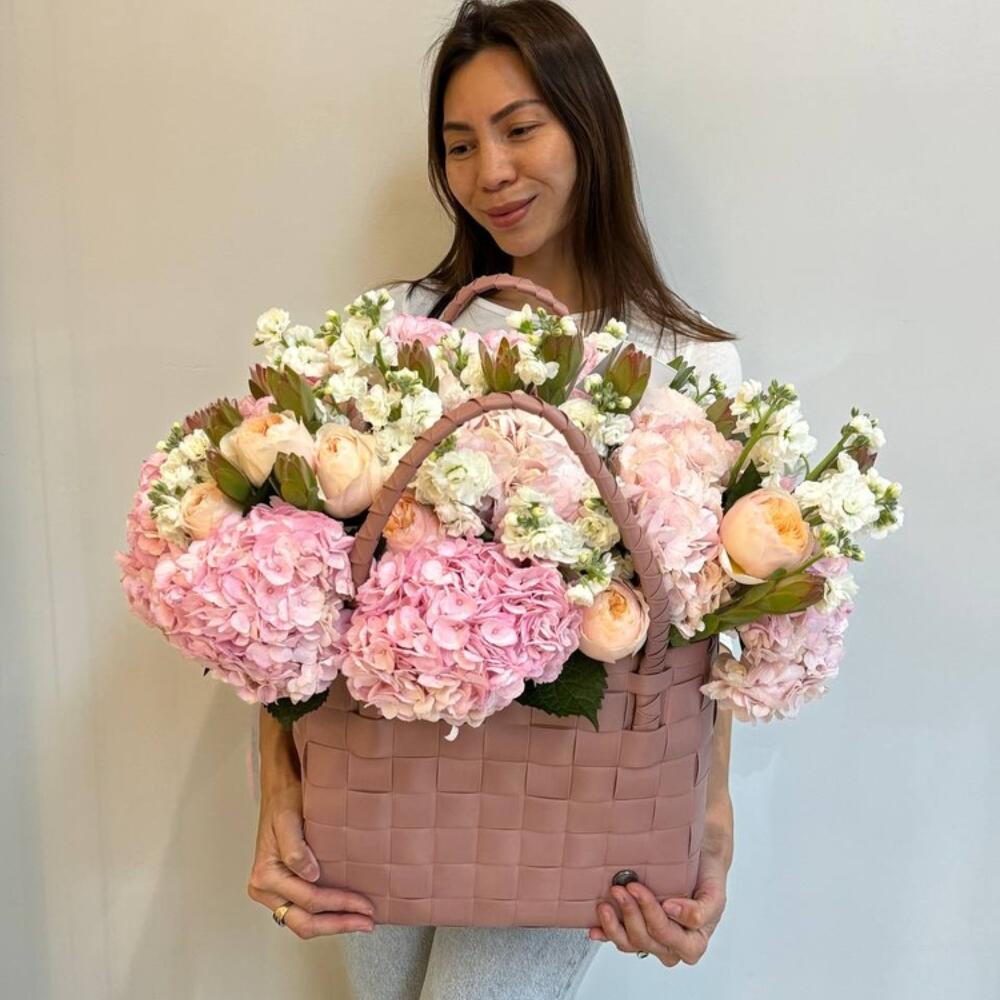 Composition: Hydrangea - 7, kaaps - 8, Mattiola spray - 7, Dianthus spray - 8, Rose David Austin - 7, oasis - 1, bag - 1 Sizes: WIDTH - 60CM; HEIGHT - 60CM; LENGTH - 60CM; (including packaging) Размер: 60 x 60 x 60 см