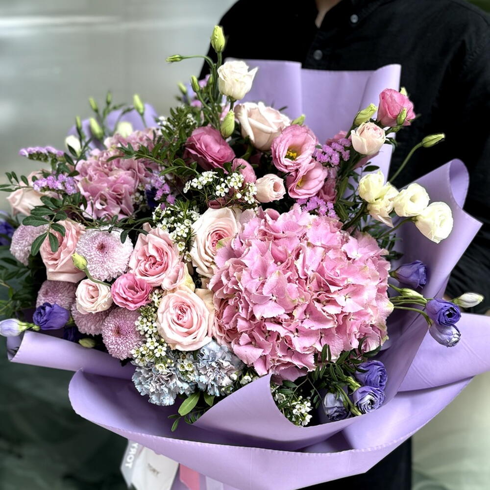 Composition: Hydrangea - 3, Pistacia - 6, Lisianthus - 15, Chrysanthemum Momoko - 5, Rose Pink Ohara - 7, Chamelacium - 3, Dianthus - 4, wrapping - 5, ribbon - 2 Sizes: WIDTH - 50CM; HEIGHT - 65CM; LENGTH - 65CM; (including packaging) Size: 50 x 65 x 65 cm