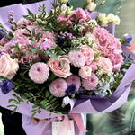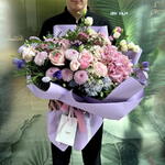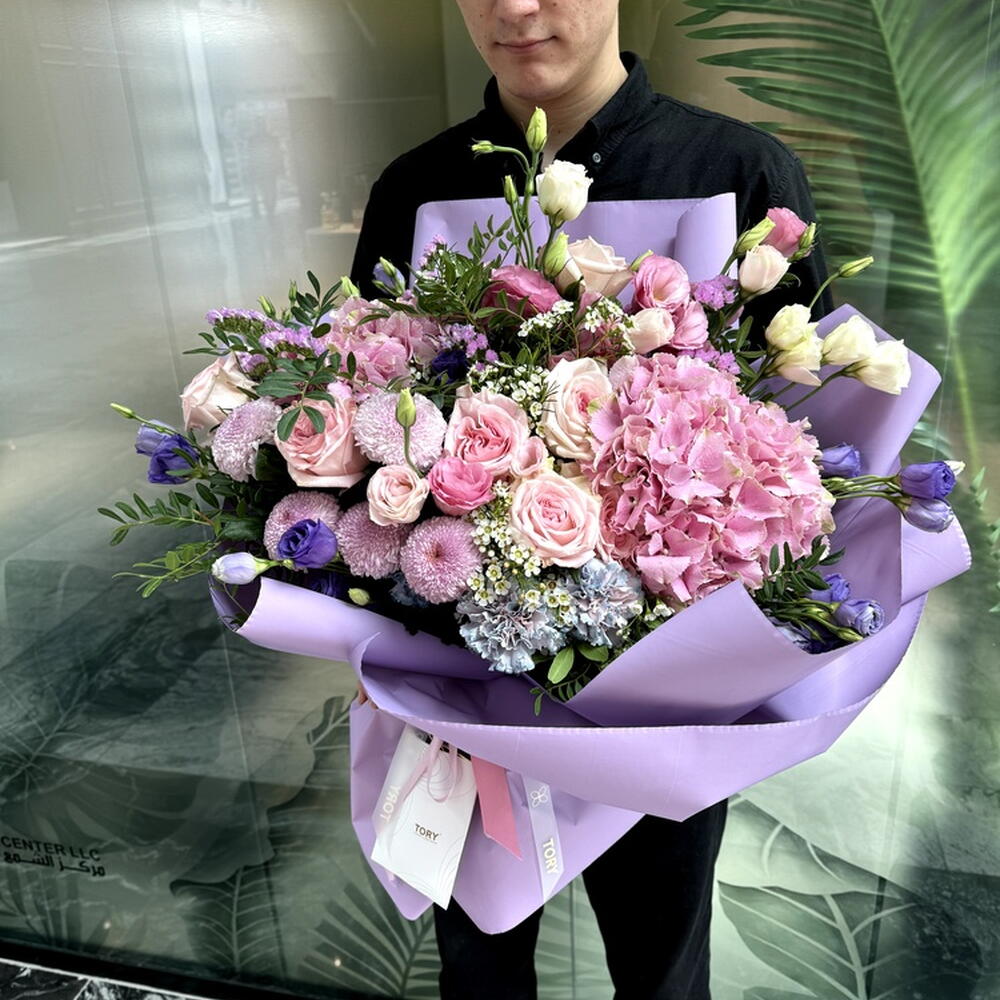 Composition: Hydrangea - 3, Pistacia - 6, Lisianthus - 15, Chrysanthemum Momoko - 5, Rose Pink Ohara - 7, Chamelacium - 3, Dianthus - 4, wrapping - 5, ribbon - 2 Sizes: WIDTH - 50CM; HEIGHT - 65CM; LENGTH - 65CM; (including packaging) Size: 50 x 65 x 65 cm