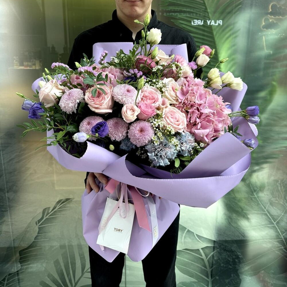 Composition: Hydrangea - 3, Pistacia - 6, Lisianthus - 15, Chrysanthemum Momoko - 5, Rose Pink Ohara - 7, Chamelacium - 3, Dianthus - 4, wrapping - 5, ribbon - 2 Sizes: WIDTH - 50CM; HEIGHT - 65CM; LENGTH - 65CM; (including packaging) Size: 50 x 65 x 65 cm