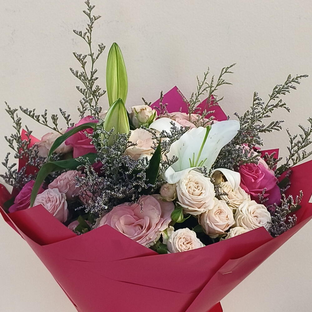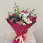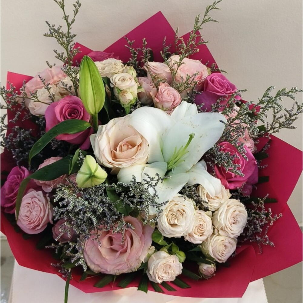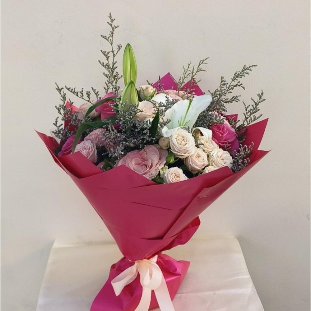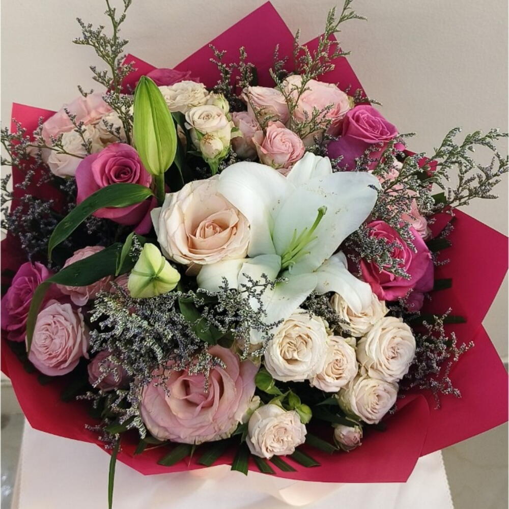 2pcs lilly, white rose, pink rose, baby Rose and ruscus mix in middle with beautiful Dark pink wrapping