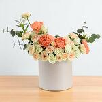 A delightful mix of vibrant orange carnations, soft peach roses, and elegant white spray roses, this arrangement conveys warmth, elegance, and heartfelt emotions, making it a perfect gift for any occasion.