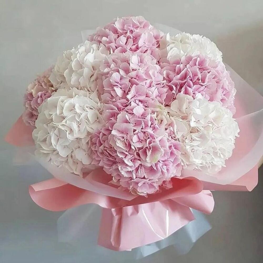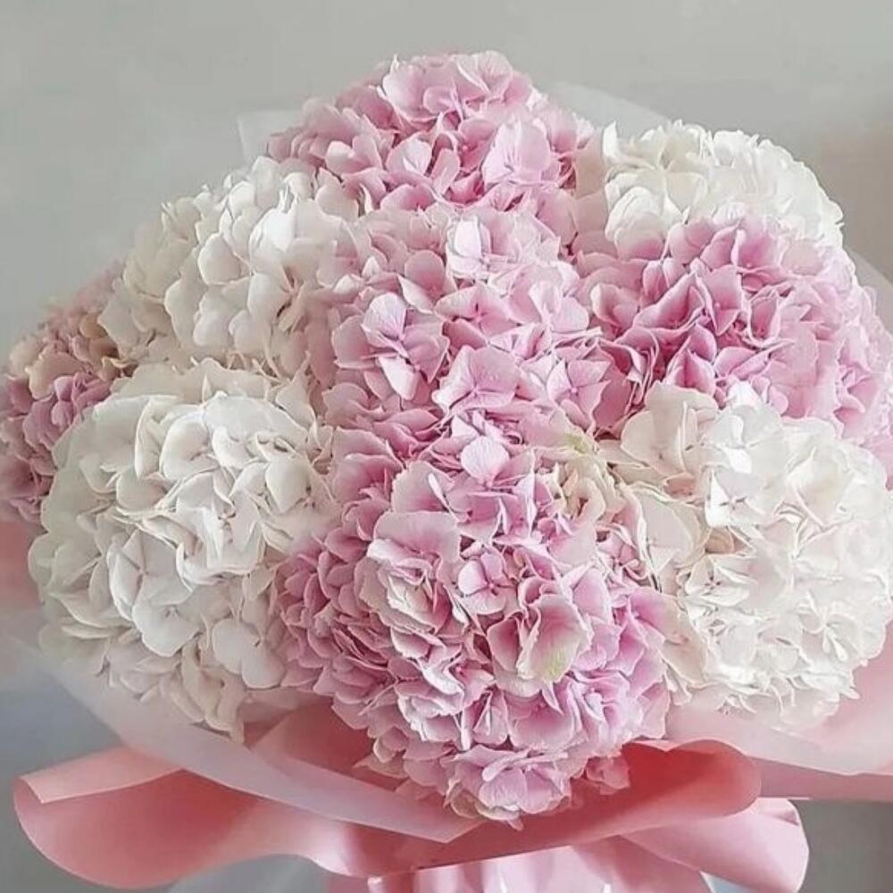 A soft and charming bouquet of *light pink and white hydrangeas*, elegantly wrapped in delicate white and pastel pink paper, tied with a sheer pink ribbon. The hydrangeas symbolize heartfelt emotions, gratitude, and understanding, making this bouquet a gentle and graceful gift for birthdays, anniversaries, or to say “thank you” or “I care.” *Tone:* Feminine, tender, and elegant — perfect for someone with a soft and warm personality.