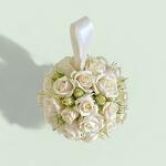 This charming and elegant pomander ball is crafted from numerous delicate cream-colored roses, tightly arranged to form a perfect spherical shape. A beautiful satin ribbon loop extends from the top, allowing it to be carried or hung. Its an ideal accessory for bride and weddings