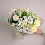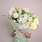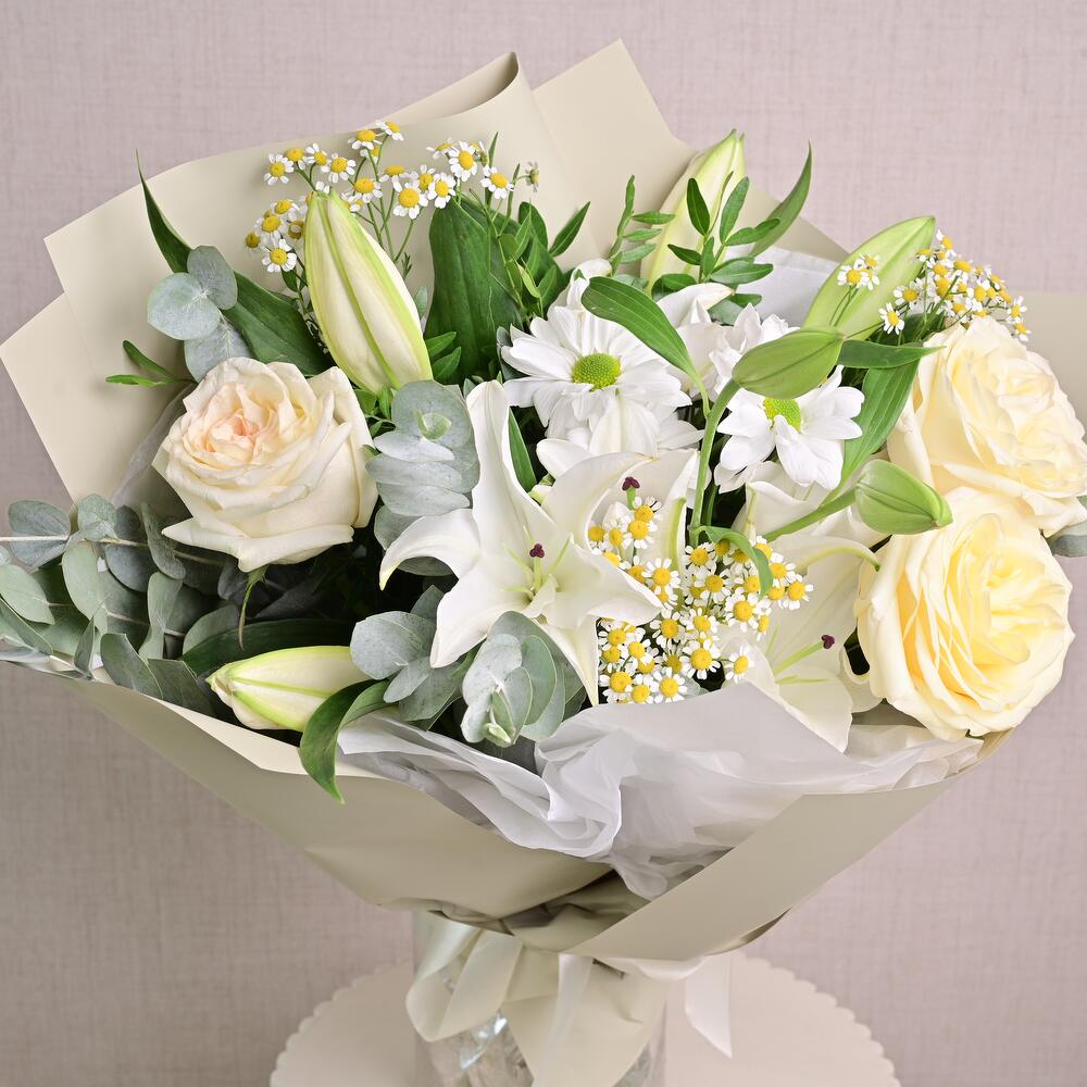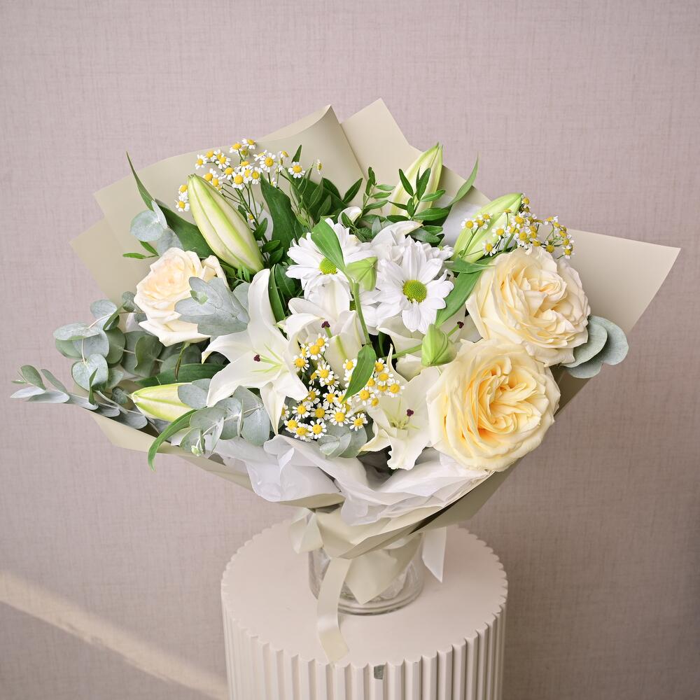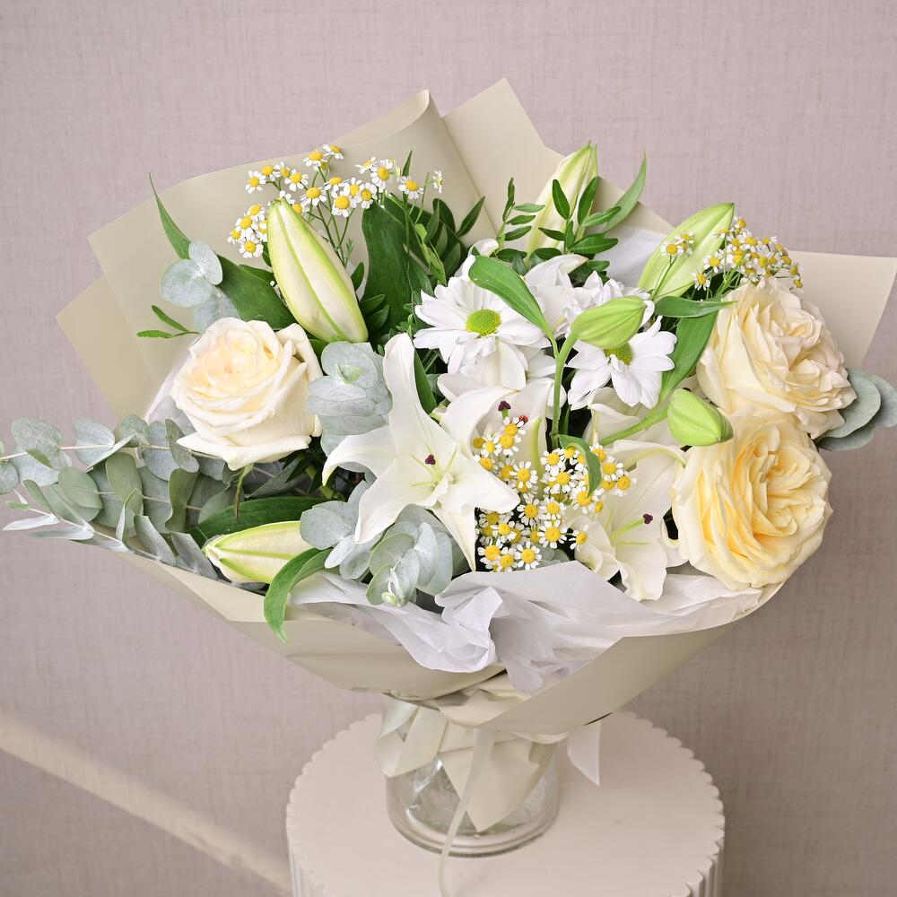 Ribbon - 1 pcs Eucalyptus - 2 pcs tanacetum - 3 pcs white lilly - 3 pcs wrapping paper - 4 pcs cream expression roses - 3 pcs chrysanthmum - 1 pcs