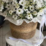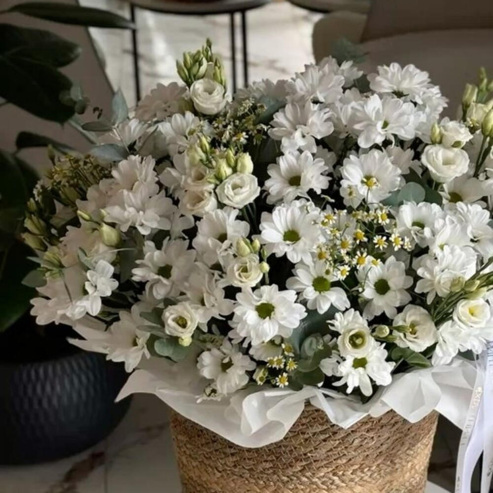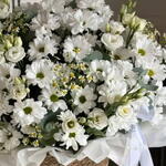 chamomile - 25 pcs spray chrysanthemum - 30 pcs rebbon - 1 pcs box or bag - 1 pcs