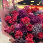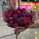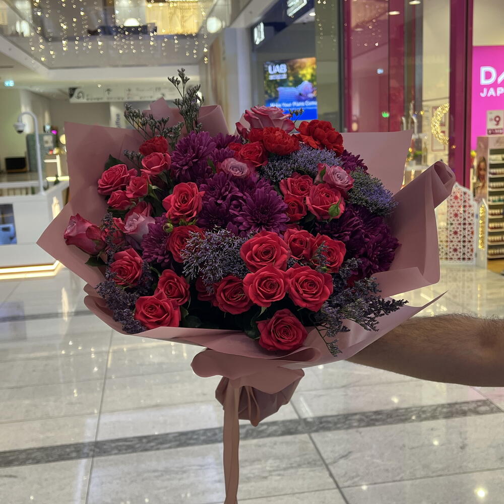 Ribbon - 1 pcs Limonium - 5 pcs Chrysanthemum - 4 pcs Wrapping - 4 pcs fuchsia rose - 5 pcs fillers - 8 pcs