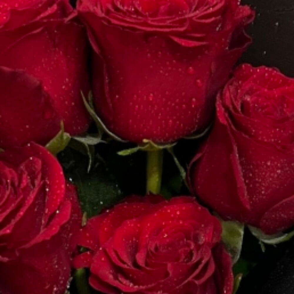a vibrant bouquet of fresh red roses. The bouquet features a collection of deep red roses, often symbolizing love, passion, and devotion.