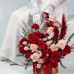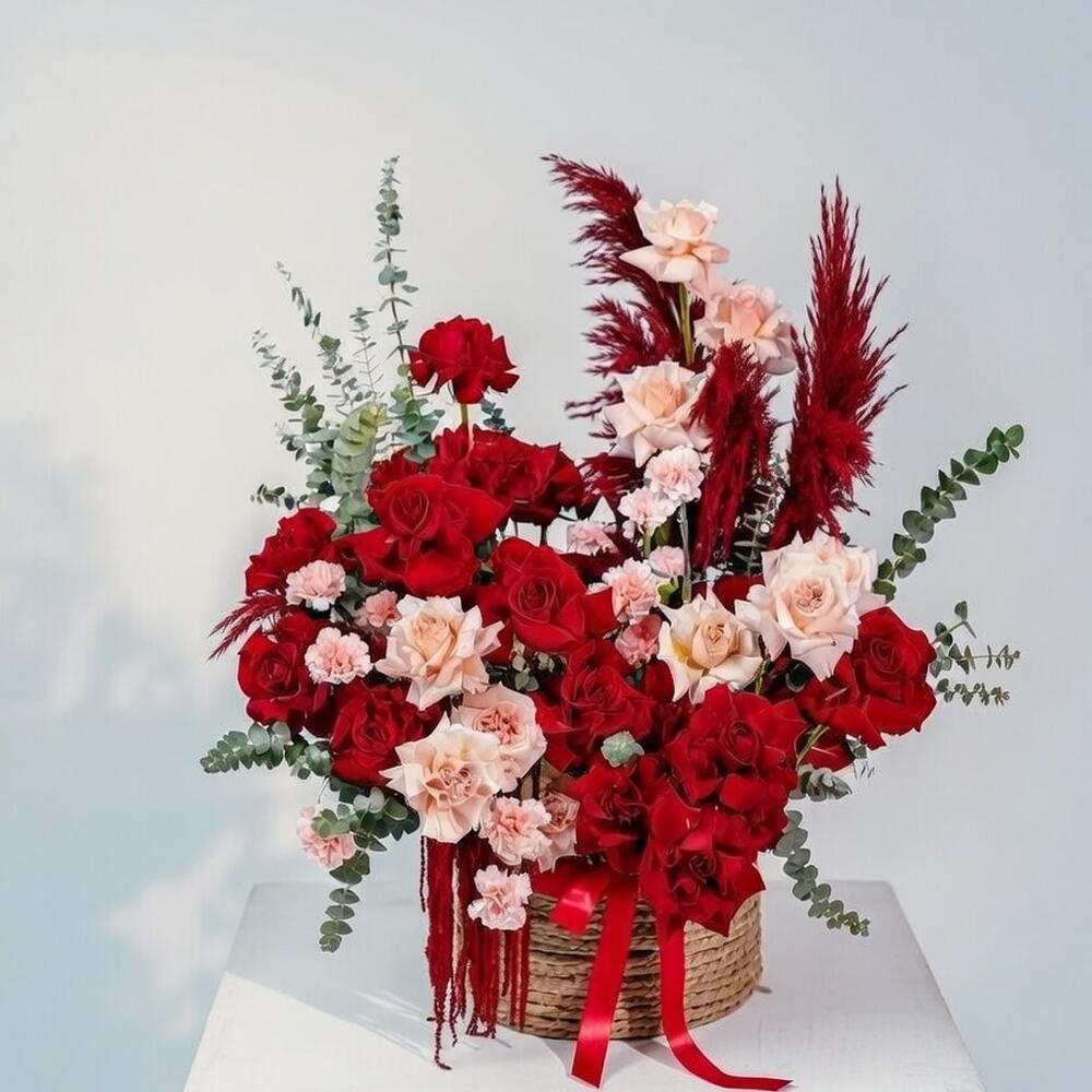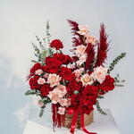 This dramatic and asymmetrical basket arrangement is a masterclass in high-contrast floral design. It features a rich foundation of 15 Deep Crimson Ecuador Roses, known for their velvety texture and large head size, which are beautifully offset by 7 Nude-toned Roses. To add a soft, ruffled density, 10 bi-color Pink and Peach Carnations are artfully tucked throughout the composition. The arrangement achieves a striking architectural silhouette through the use of vertical Deep Red Pampas Grass and trailing Red Amaranthus, which spills elegantly over the side of the basket. Silver-Green Eucalyptus provides a fresh, organic framework and a touch of cool-toned contrast. Presented in a sturdy, low-profile woven basket with a matching red satin ribbon, this bold arrangement is an ideal choice for grand romantic gestures, high-end anniversaries, or statement-making interior decor. Dimensions Box + Flowers: Height 60 cm / Width 55 cm Dimensions Box: Height 30 cm / Width 23 cm