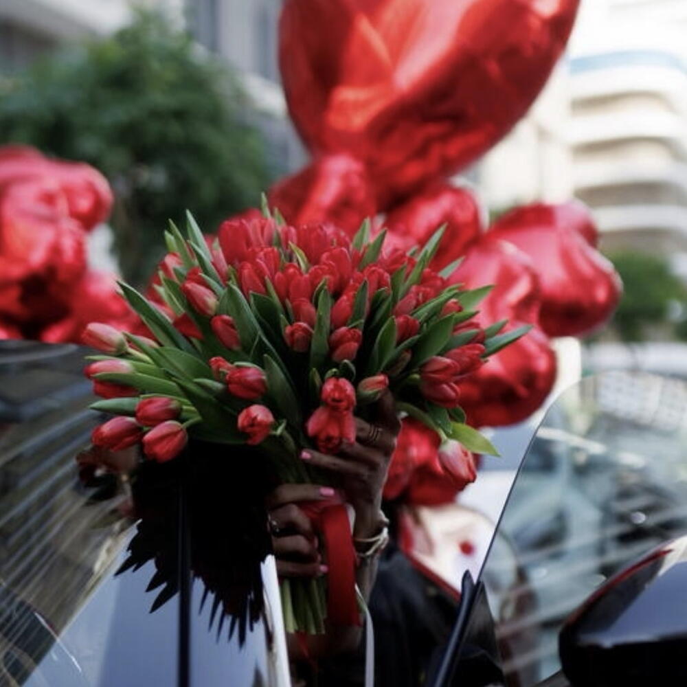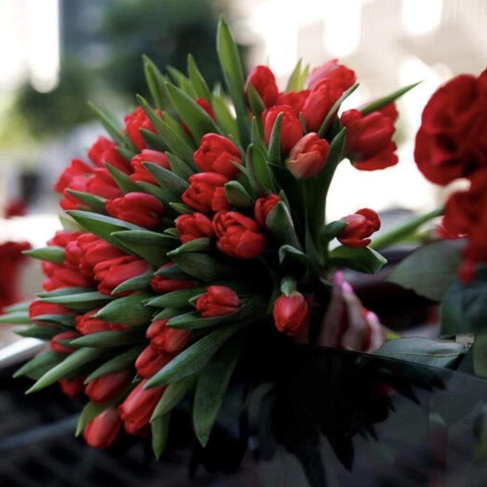 A vibrant and elegant bouquet of 50 freshly cut red tulips, carefully arranged to create a clean, balanced, and refined silhouette. The deep crimson petals contrast beautifully with the natural greenery of the stems, giving the composition both brightness and sophistication.