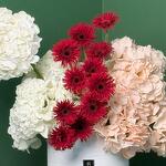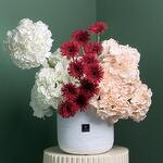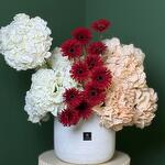 Bold yet refined, Crimson Cloud is a signature vase arrangement that beautifully contrasts the purity of white and blush hydrangeas with the intensity of deep red gerberas. Set in an elegant textured ceramic vase, this statement piece evokes both softness and passion — perfect for modern interiors, grand gestures, or unforgettable celebrations. It’s more than flowers — it’s an expression of presence and power.