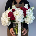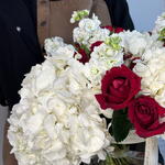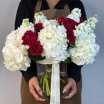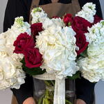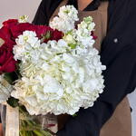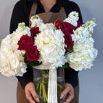 Indulge in timeless romance with this exquisite floral centerpiece. Lush, cloud-like White Hydrangeas create a luxurious backdrop for the rich, velvety petals of premium Deep Red Roses. Accented with delicate spikes of White Stock, this arrangement is a captivating blend of classic beauty and heartfelt passion. Expertly designed in a clear glass vase, its the perfect statement for anniversaries, declarations of love, or simply to add sophisticated charm to any setting.