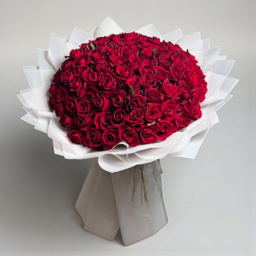 An opulent dome of deep red roses, flawlessly arranged and wrapped in pure white elegance—designed to make a bold statement of passion, devotion, and unforgettable romance.