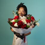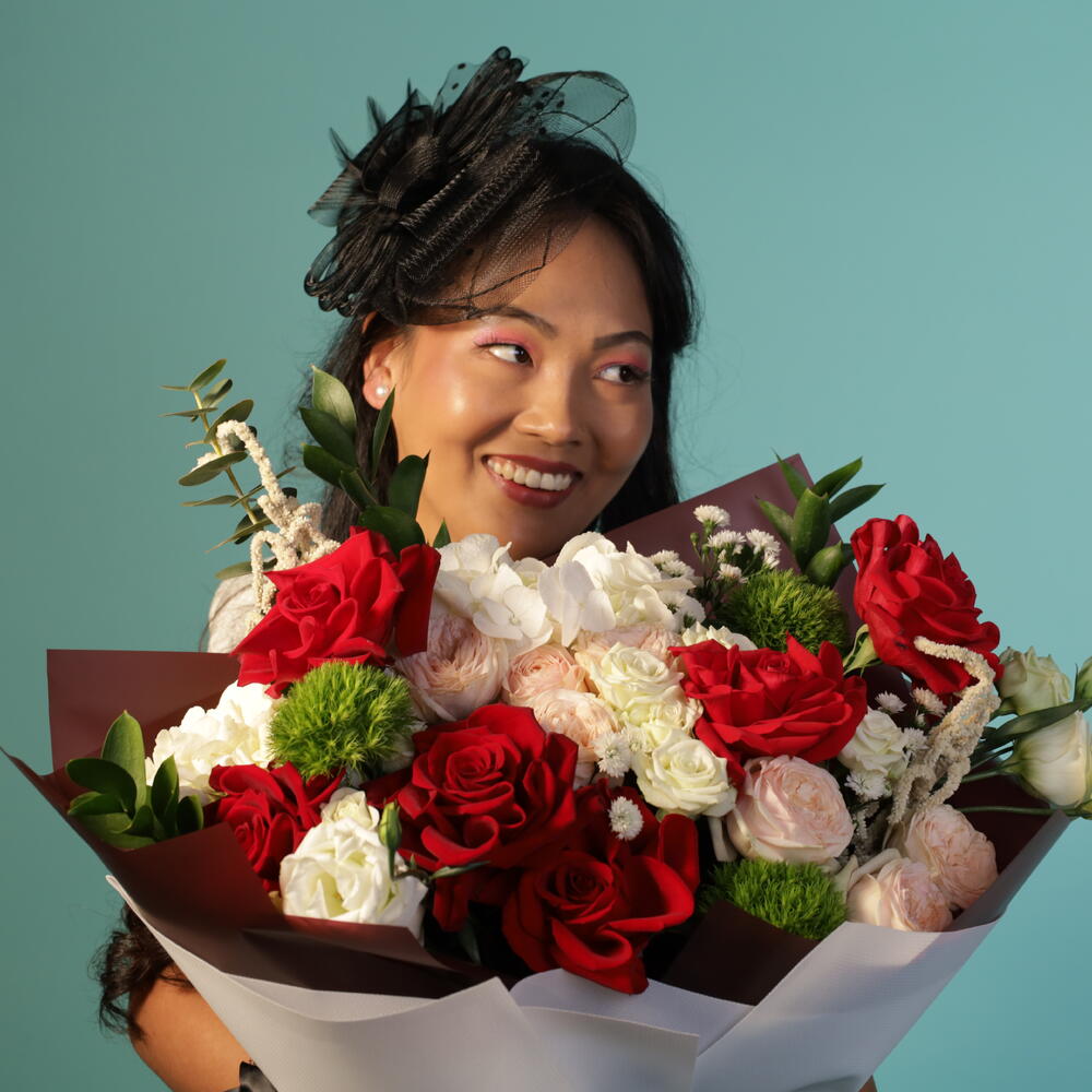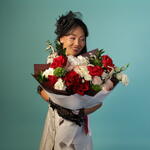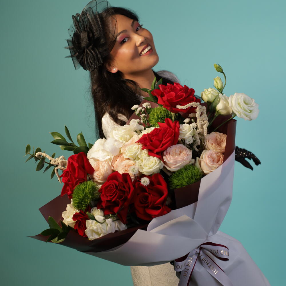 A beautifully balanced bouquet featuring lush red roses paired with creamy whites, soft blush garden-style blooms, and textured greenery. Rich in colour and thoughtfully arranged, it’s a refined expression of care, celebration, and lasting impression.
