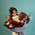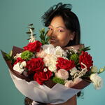 Red rose - 6 pcs Eucalyptus - 2 pcs Ruscus - 2 pcs Spray rose - 3 pcs White rose - 2 pcs white spray rose - 2 pcs design packaging - 10 pcs white spray rose cream - 2 pcs dianthus kiwi mellow - 2 pcs