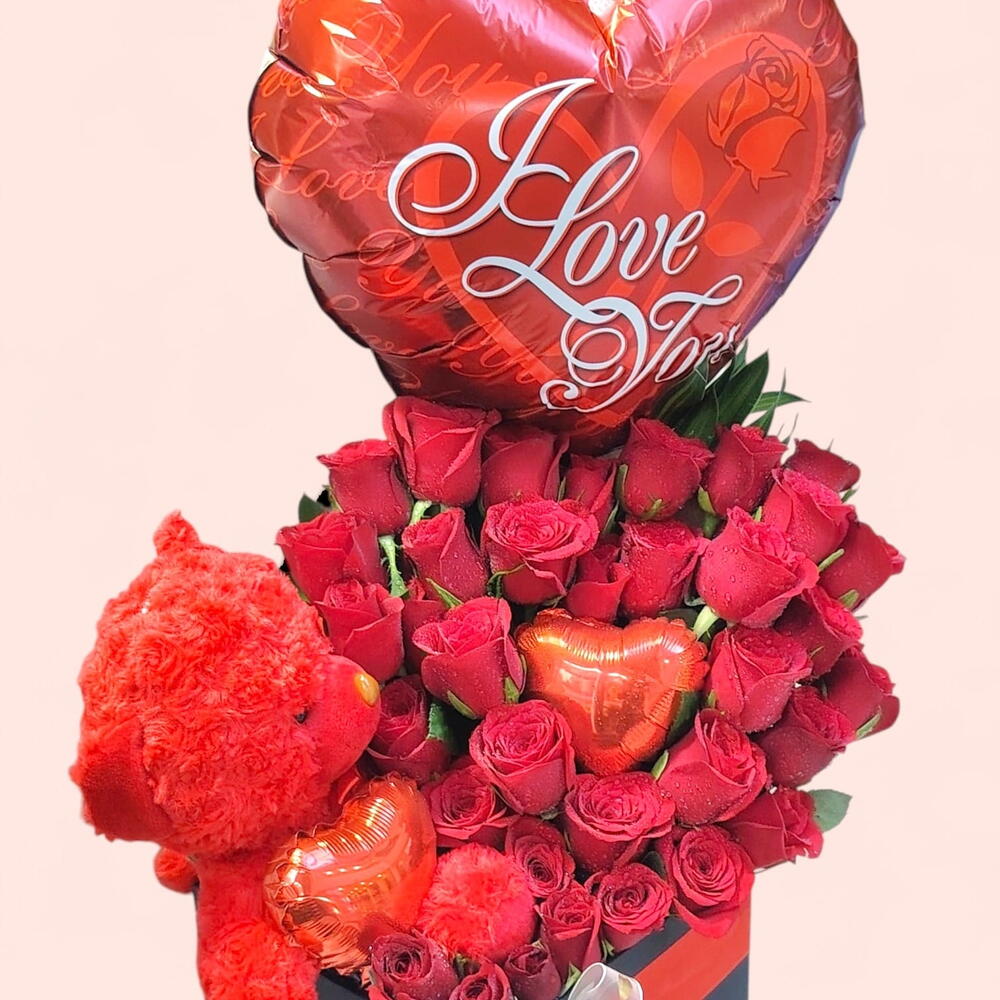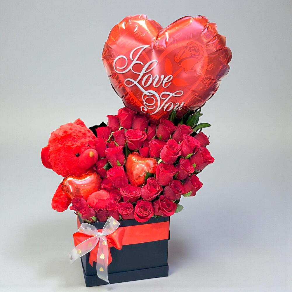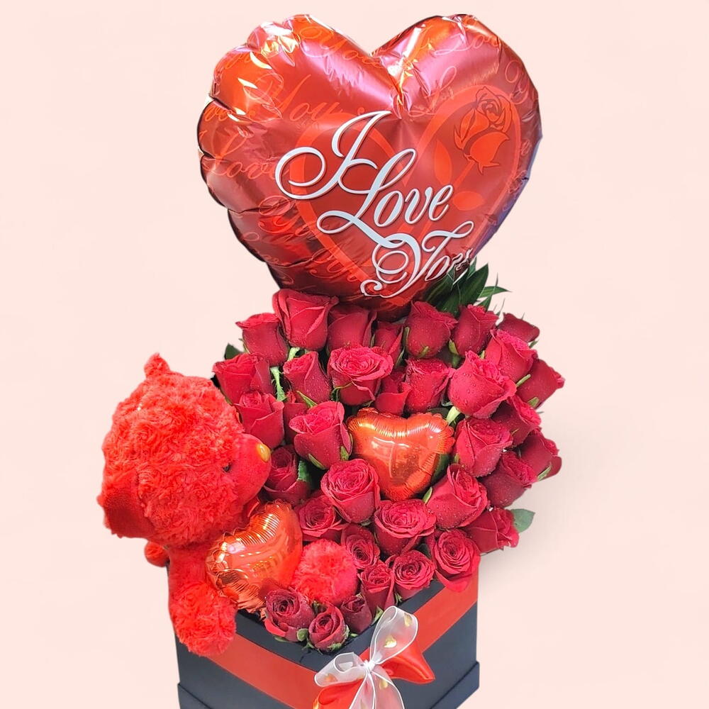 Ribbon - 1 pcs Teddy bear - 1 pcs square box - 1 pcs roses - 30 pcs small heart - 1 pcs heart ballon - 1 pcs