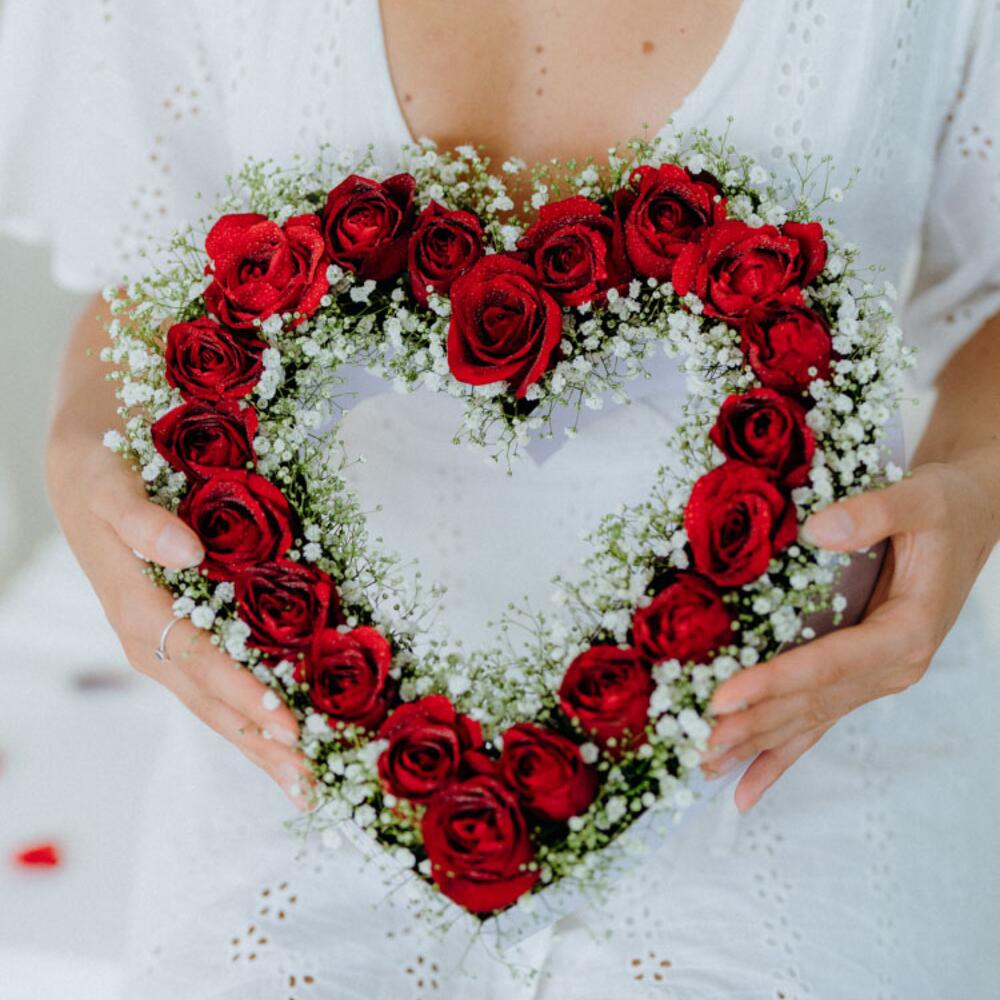Make a bold statement with a cascade of crimson roses. Each bloom symbolizes a passionate kiss, creating a dramatic and unforgettable expression of love.