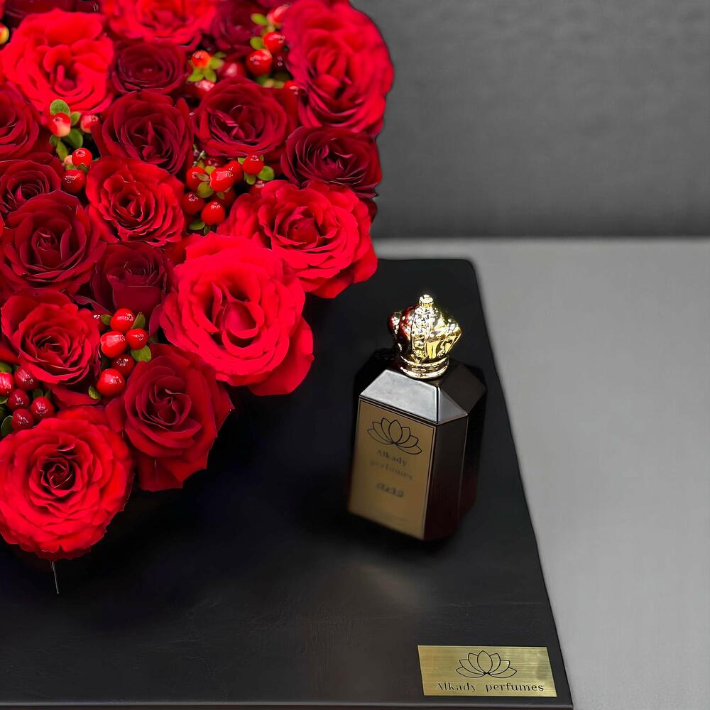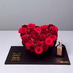 red roses - 20 pcs red baby roses - 5 pcs red hypericum on a black leather stand - 5 pcs bottle of story perfume - 100 ml