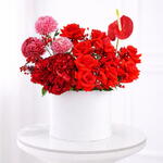 Red rose - 10 pcs anthurium red - 1 pcs haydrnga red - 1 pcs chrysanthemum ben boom - 3 pcs accessory wax red - 2 pcs