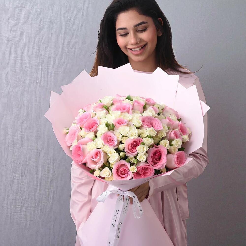 Make a majestic statement of love and admiration with the Crown of Petals – 50 Roses Zuvees Signature Bouquet. Overflowing with luxurious blooms in romantic hues of pink and white, this magnificent bouquet embodies heartfelt grandeur and feminine grace. A signature Zuvees creation, this regal arrangement is the perfect centrepiece for life’s most memorable moments.