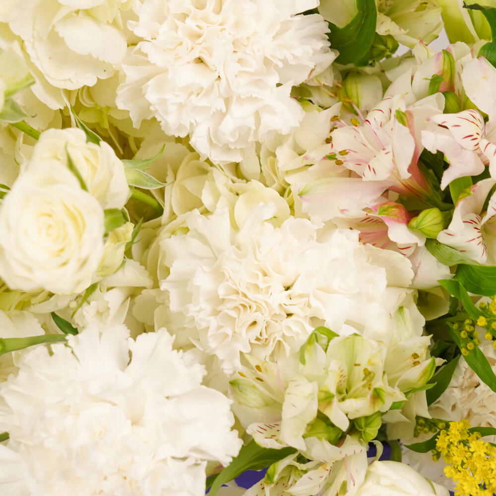 alstroemeria white - 5 pcs lily white - 5 pcs carnation white - 10 pcs hydrangea white - 5 pcs solidago yellow - 10 pcs spray rose white - 10 pcs eucalbtus gold - 5 pcs zezzle blue round box - 1 pcs