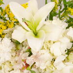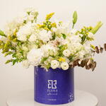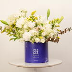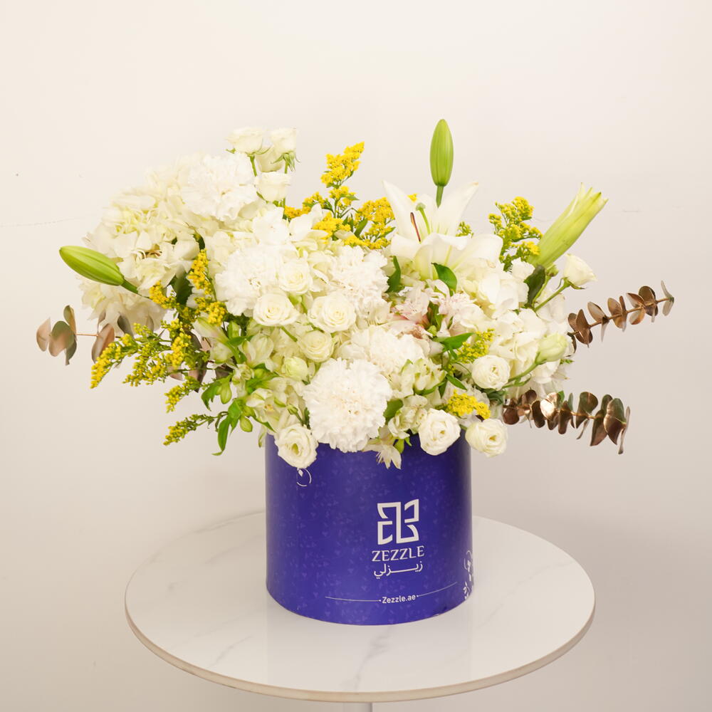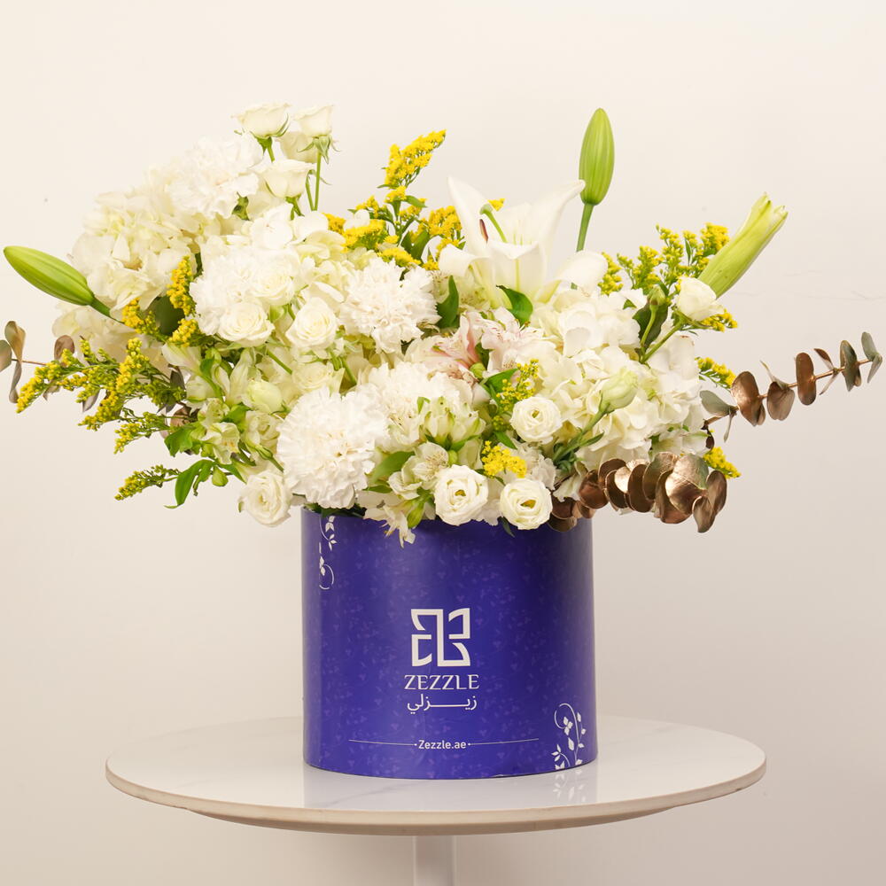 Immerse yourself in the epitome of beauty and elegance with our offering of the stunning Flowers in a Box. Gracefully nestled inside a zezzle blue round box lies an enchanting arrangement of blooming florals which includes 5 hearty hydrangeas and lilies, each in the most delicate shade of opulent white. The arrangement is adorned with 10 bountiful spray roses, carnations, and solidago stems, all dipped in purest white and accented with a dash of vibrant yellow. Amplifying the lush ensemble are touches of gold-toned eucalyptus and charming alstroemeria, all white, creating a perfect harmony of colors. This lovingly curated collection serves as a beautiful centerpiece or a heartfelt gift, reflecting sophistication and good taste.