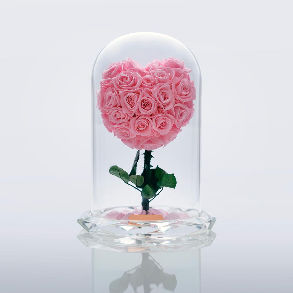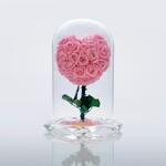 Pink forever roses in a large glass dome and a free greeting card