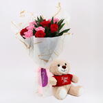 Teddy bear - 1 pcs red roses - 5 pcs pink roses - 6 pcs