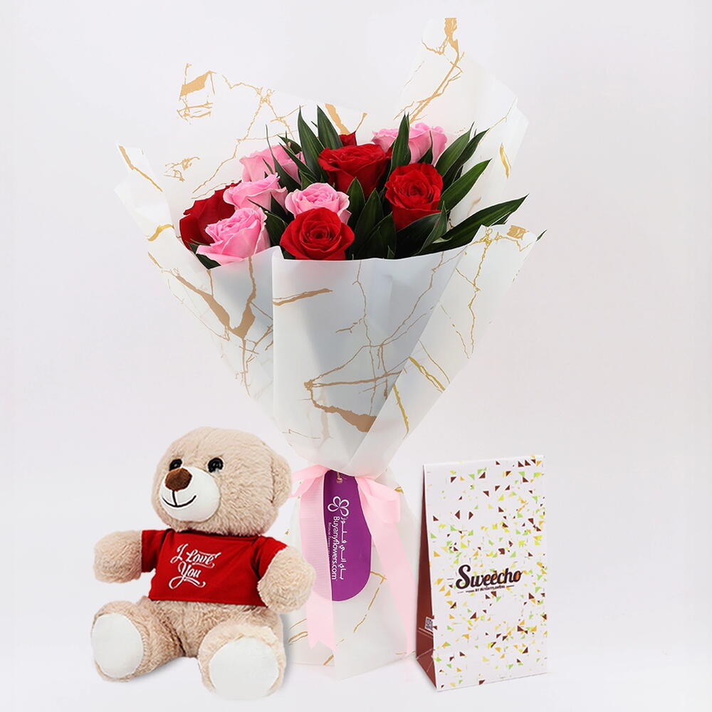 I Love You Teddy 25cm, Premium Sweecho Chocolates 100gm, 6 Pink Roses, 5 Red Roses, 2 Songs of Jamaica Leaves, Wrapped in White Marble Wrapping, Tied with Pink Ribbon.