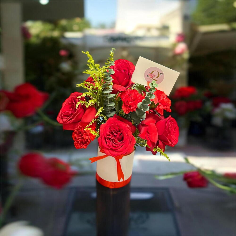 Bask in the radiant charm of this stunning Mono Bouquet. Hand-picked and carefully arranged, it features seven lush red roses — symbols of enduring love, paired with five vibrant red carnations which signify deep affection and admiration. To add a pop of sunshine and happiness, this bouquet is sprinkled with three stems of lively solidago. Neatly presented in a compact round box, this bouquet will surely warm hearts and spruce up any occasion or corner of your room. Incredible beauty and passion packed in one - the perfect gift for your loved ones.