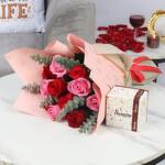 Product Details: Premium Chocolates By Sweecho 250gm 6 Red Roses 5 Pink roses Leaves: 4-5 Stems Eucalyptus Leaves Wrapped in Pink Heart and Beige Color Wrapping Tied with Red Ribbon Bow