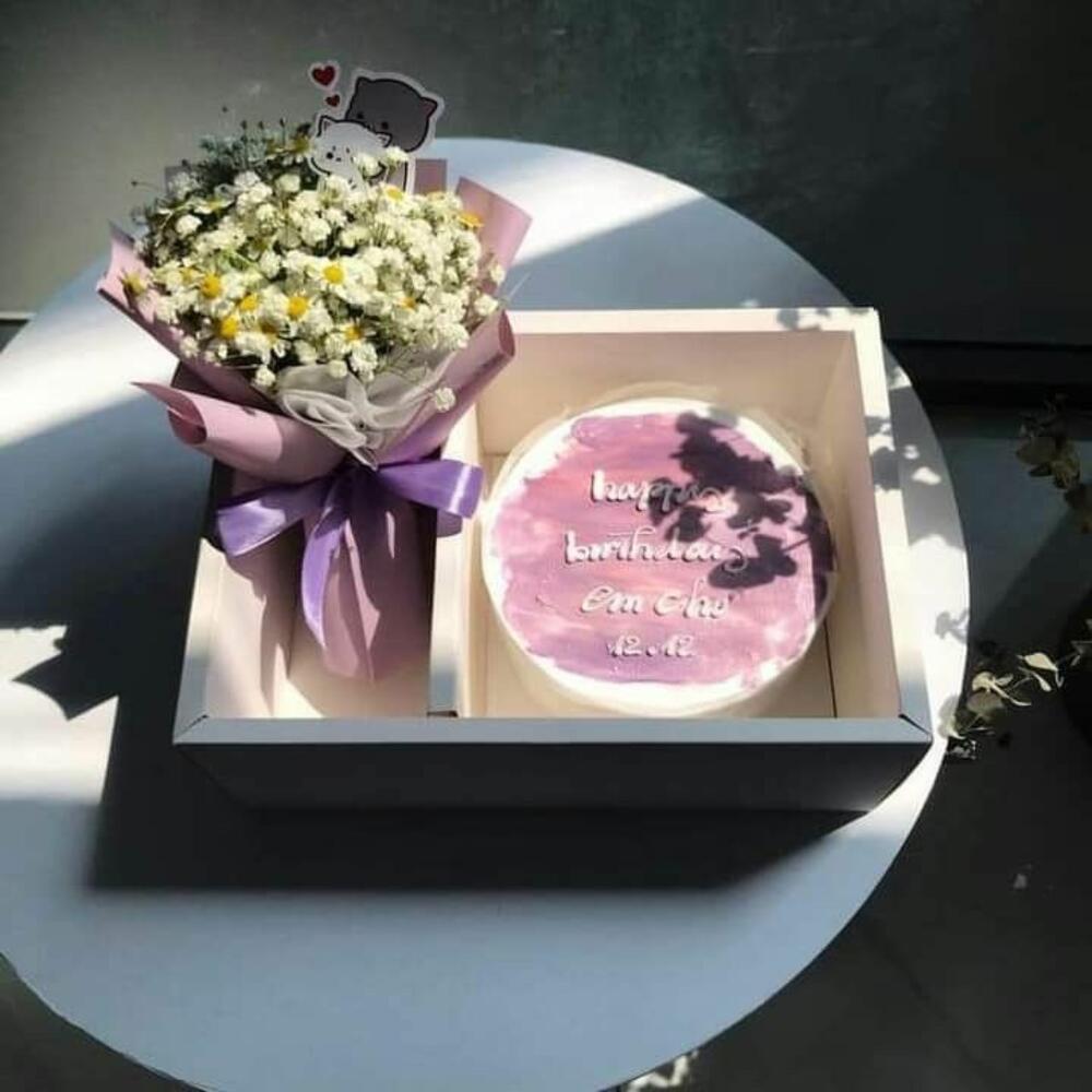 A dreamy birthday surprise set featuring a soft lavender cake paired with a delicate bouquet of mini daisies and babys breath. Wrapped in pastel pink and purple tones, this combo is perfect for adding a touch of sweetness to someone’s special day. ✨ Elegant. Soft. Thoughtful. 🎂 Cake + 💐 Flowers = Pure Birthday Bliss! Contact us to customize your own gift box