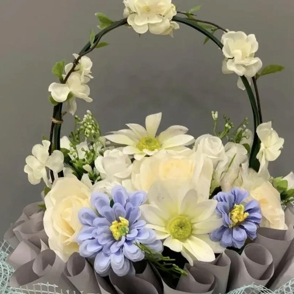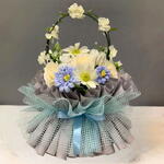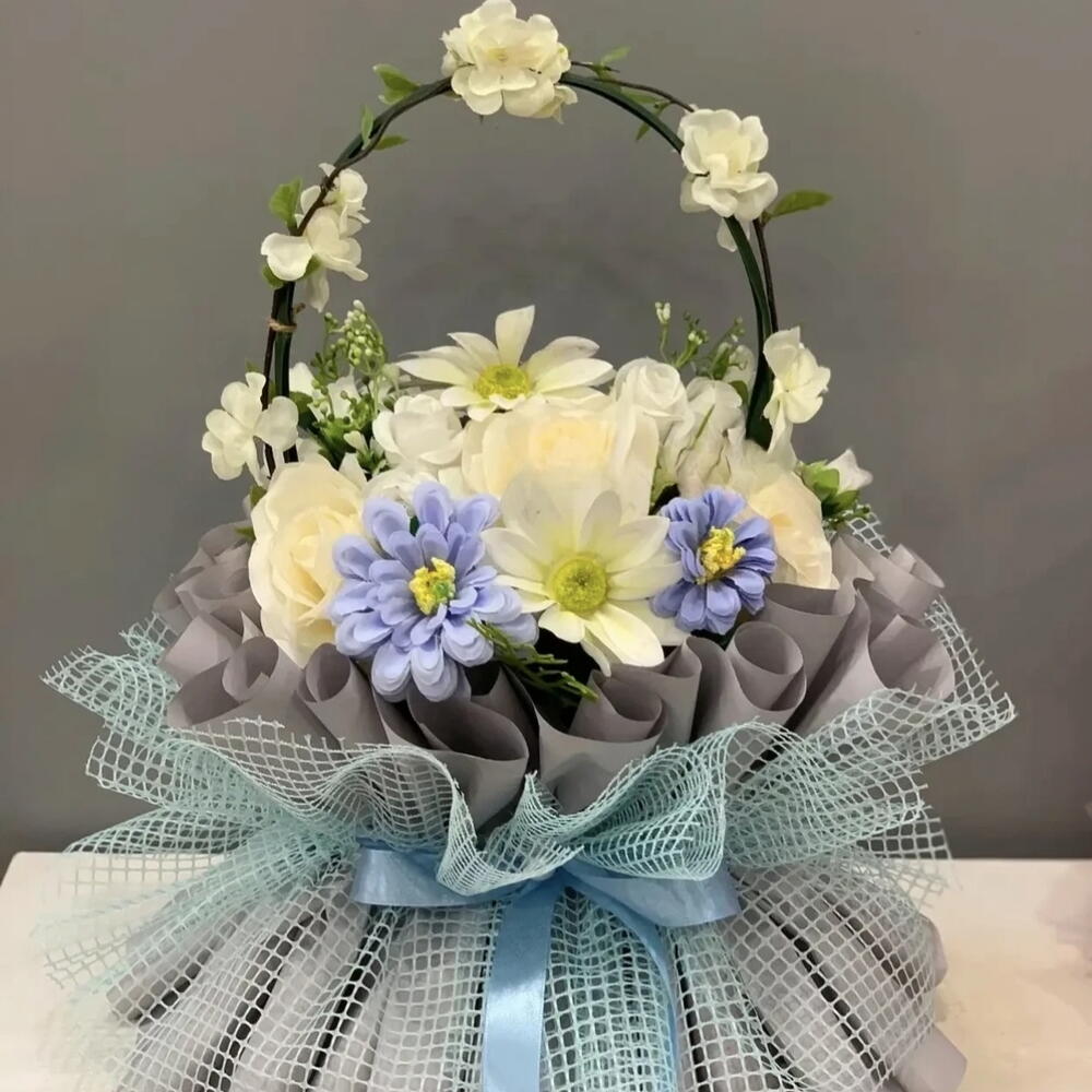 a decorative gift bouquet. The bouquet is a handcrafted item, wrapped in gray paper or fabric and arranged with a light blue mesh ribbon. A blue satin ribbon is tied around the middle. The baskets handle is a wire hoop adorned with white flowers. Inside the bouquet is a bouquet of fresh flowers, including white, yellow, and blue blooms.