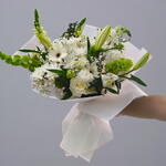 White rose - 3 pcs Chrysanthemum white - 8 pcs white lily - 5 pcs gerbera white - 2 pcs matthiola white - 5 pcs moulucella - 2 pcs