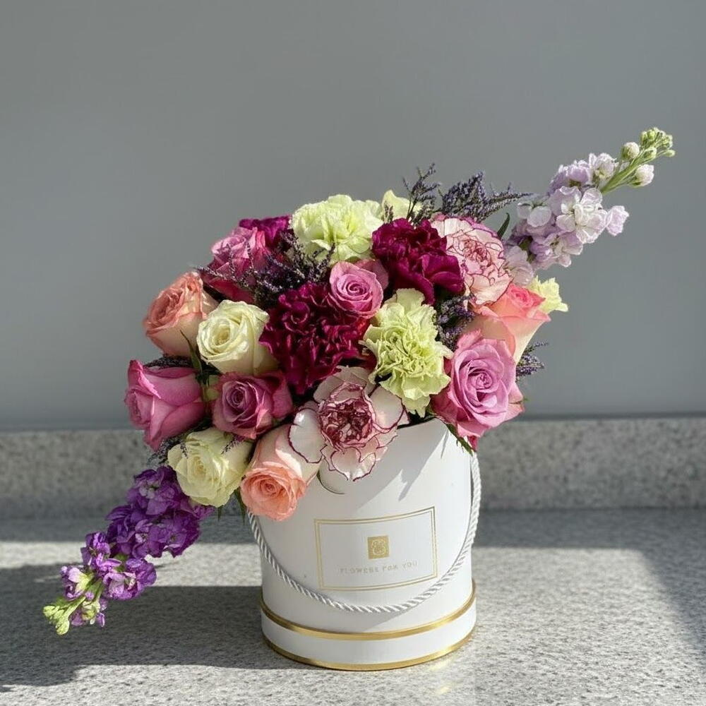 This exquisite flower box captivates with a luxurious blend of soft peach, creamy white, lavender, and deep burgundy tones, creating a rich and sophisticated look. Perfect for birthdays, anniversaries, romantic surprises, corporate gifting, Mother’s Day, or celebrating life’s special moments, it adds a refined touch to any setting. The arrangement features graceful roses, lush carnations, airy spray roses, and elegant matthiola stems that bring movement and volume. Fresh greenery and delicate fillers enhance the natural beauty of the composition, making it both harmonious and expressive. Keep the box in a cool place and ensure the floral foam inside remains slightly moist by adding a small amount of water every 1–2 days. Avoid placing it in direct sunlight or near heaters to maintain freshness. With simple care, this stunning arrangement will continue to delight for many days.