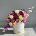 White rose - 4 pcs carnations - 6 pcs matthiola - 2 pcs purple rose - 5 pcs limonium purple - 6 pcs jumilia roses - 5 pcs