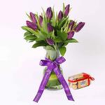 ferrero rocher chocolates - 7 oz purple tulips - 11 pcs single ruscus - 3 pcs glass vase and tied with a ribbon bow - 1 pcs