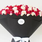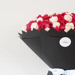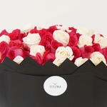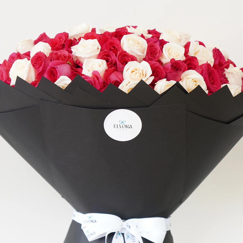Dark Pink And White Roses Classic Harmony Bouquet feels balanced and timeless. Deep red roses are paired with soft ivory blooms, creating a contrast that feels elegant rather than bold. Wrapped in black, the flowers stand confidently, allowing their colours to remain the focus without distraction. High-end Valentine’s Day flower arrangements for special moments.