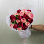 A stunning hand bouquet featuring a harmonious blend of dark pink and soft pink blooms, radiating elegance and charm. The rich dark pink flowers symbolize admiration and passion, while the gentle pink hues convey grace and affection. Together, they create a balanced and sophisticated arrangement, perfect for any occasion. Wrapped with care, this bouquet is a thoughtful and beautiful gesture, adding warmth and a touch of romance to every moment.