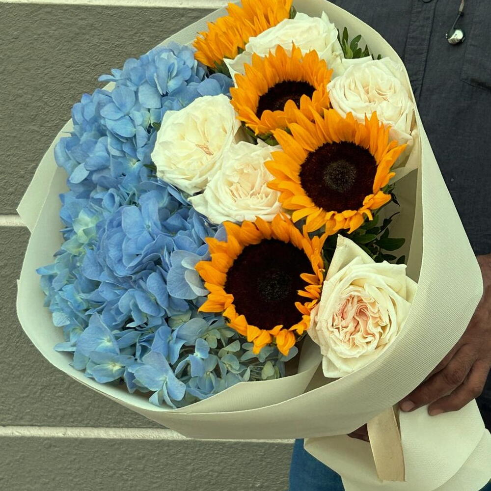 Sunflower - 4 pcs hydrangea blue - 2 pcs wrapping paper - 4 pcs ohara white - 5 pcs