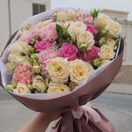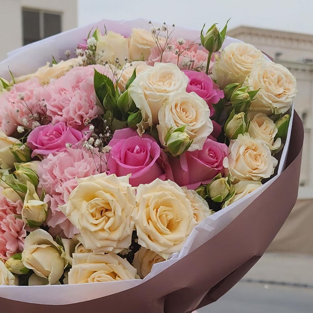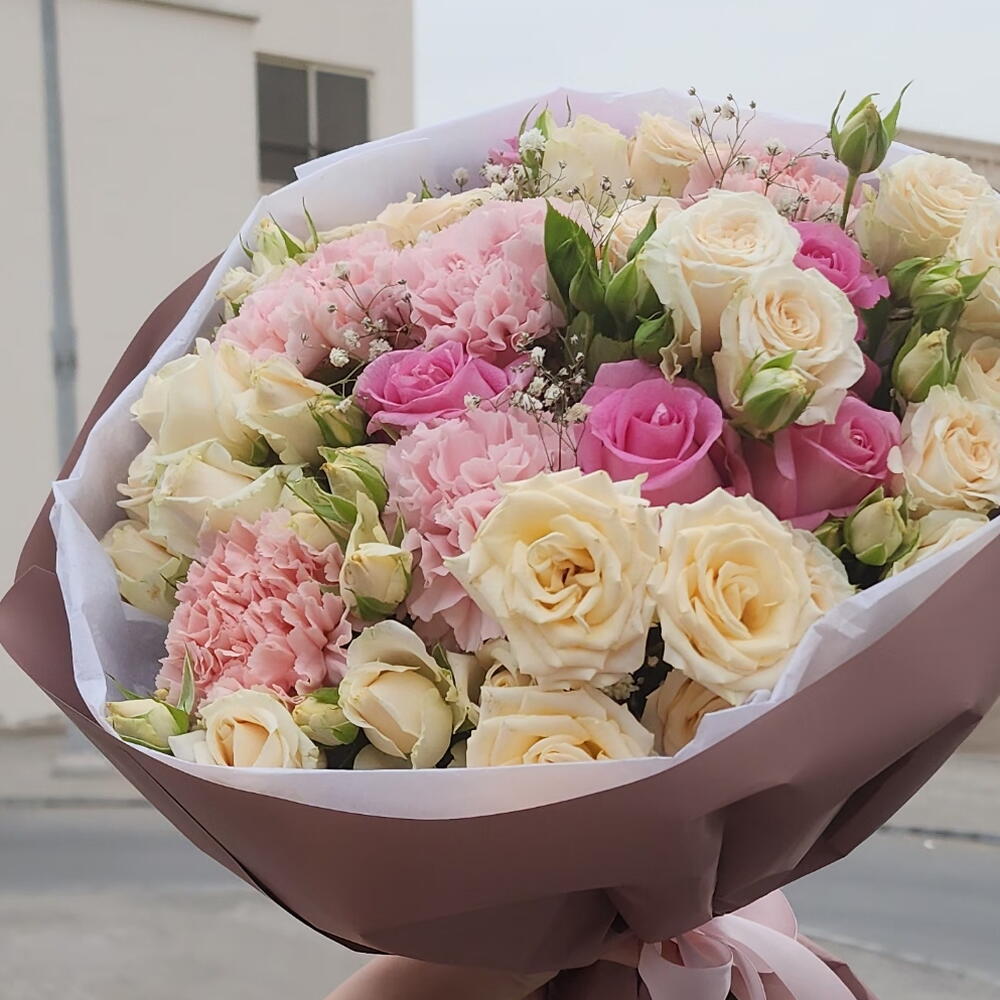 Wrapping - 4 pcs dianthus - 5 pcs rebbon - 1 pcs greenery - 5 pcs pink roses - 5 pcs baby roses - 5 pcs