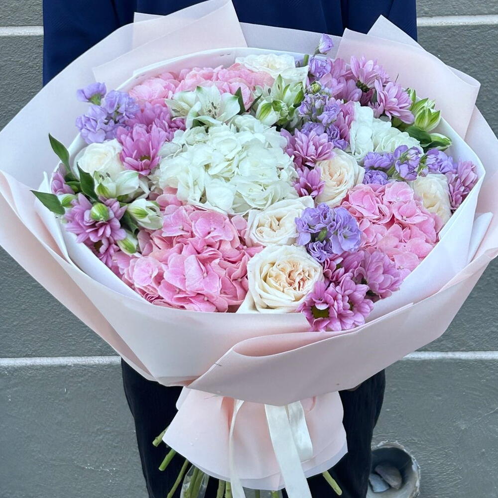 alstroemeria white - 5 pcs chrysanthemum pink - 5 pcs hydrangea pink - 2 pcs hydrangea white - 2 pcs mathiola purple - 5 pcs